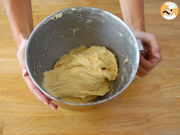 Coupez le beurre en morceaux, et ajoutez le petit à petit tout en continuant de pétrir. Laissez ensuite pétrir à vitesse moyenne une dizaine de minutes. La pâte devrait se décoller des bords. Mettez au frais 1h30.