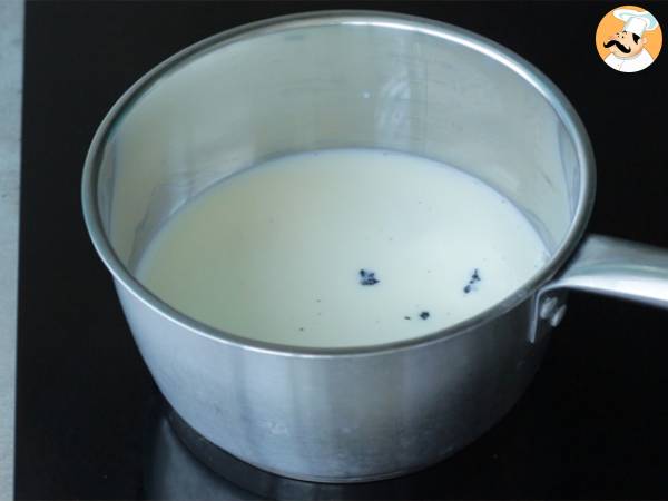 Mettez le lait à bouillir avec la gousse de vanille fendue. Pendant ce temps, mettez les jaunes d’œuf dans un bol et ajoutez le sucre. Fouettez énergiquement jusqu'à ce que le mélange blanchisse.