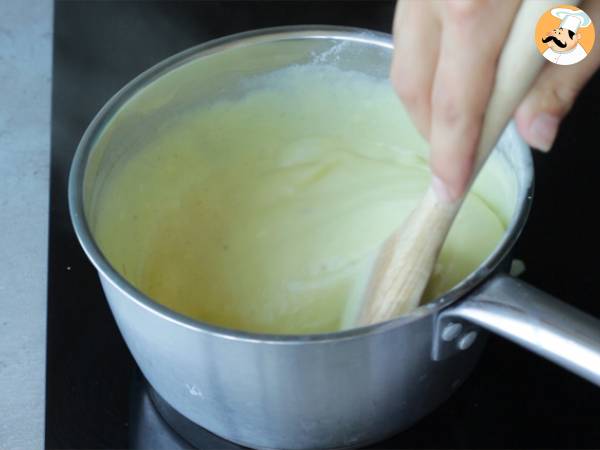 Mélangez constamment avec une cuillère en bois, jusqu'à ce que le mélange atteigne la consistance souhaitée. Cette étape prend environ 10 minutes. Puis laissez-la refroidir, en la couvrant d'un film plastique directement contre la crème, pour éviter la formation d'une peau.