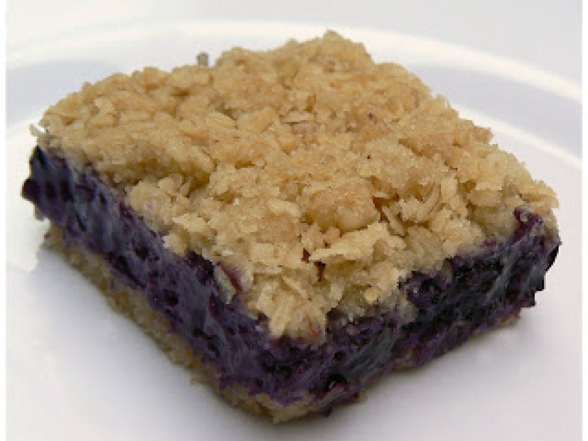 Couvrir avec la préparation aux bleuets et ajouter l'autre moitié du mélange sur le dessus, en pressant légèrement. - Cuire au four à 350°F environ 30 minutes.