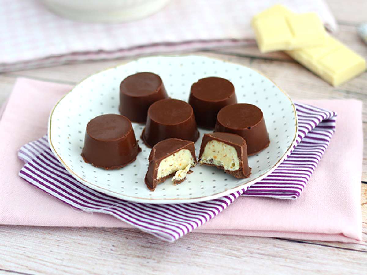 Remplissez les chocolats du mélange chocolat blanc pralin, et mettez au frais 1 heure.