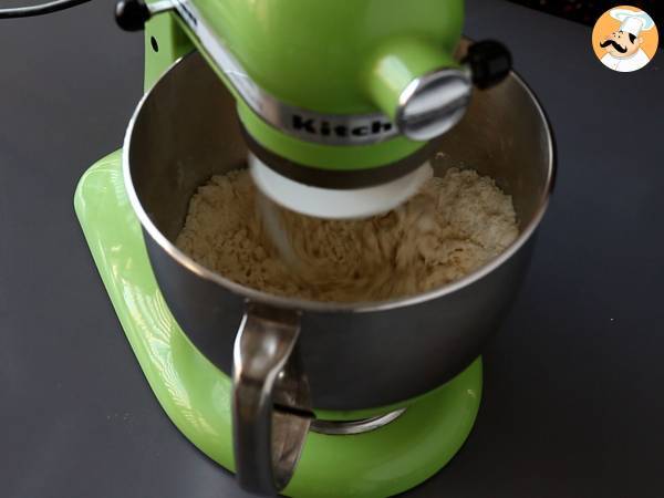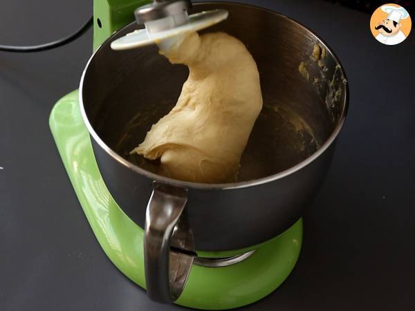 Incorporer les œufs 1 par 1 puis ajouter le beurre pommade petit à petit. Lorsque tout le beurre est incorporé, pétrir la pâte pendant environ 10 minutes.