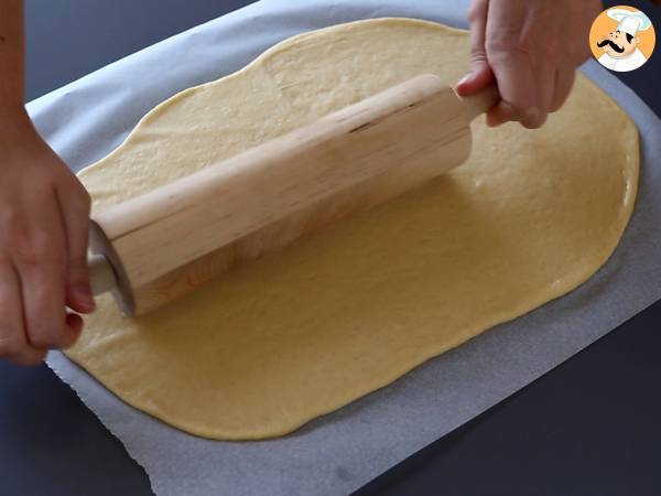 Etaler la pâte sur le papier sulfurisé à l'aide du rouleau à pâtisserie pour qu'elle fasse environ 30x40 cm.