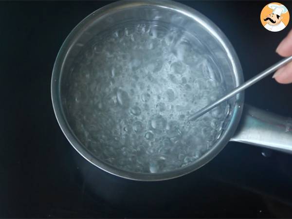 Mettez l'eau et le sucre dans un casserole et portez à ébullition. Placez-y un thermomètre, la température doit atteindre 130°C (ou laissez bouillir environ 5 minutes).