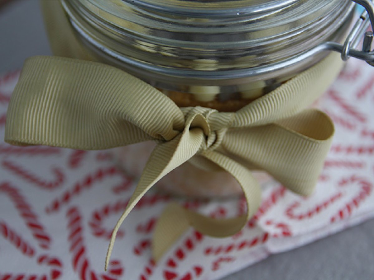 Entourer le bocal fermé avec le ruban et le nouer en formant un gros nœud. Offrir le bocal :-)