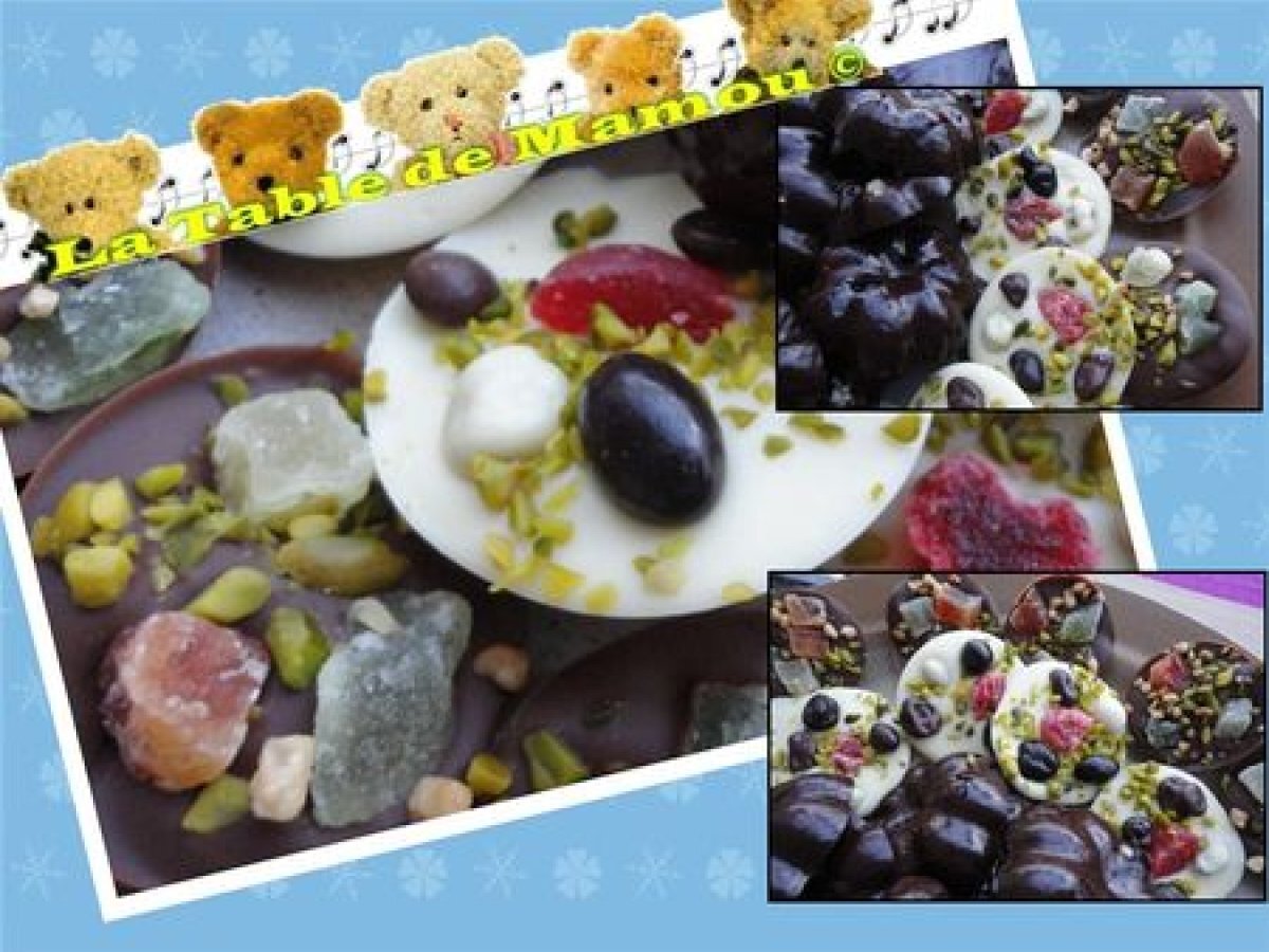Mendiants au chocolat au lait, noir et blanc Goûterfacile12 min857 Kcal Envoyer cette recette à un ami Imprimer cette page Poser une question à l'auteur Publier votre photo de cette recette Ingrédients 4 200 g de chocolat au lait pistaches nature hachées noisettes hachées mélange de fruits secs 200 g de chocolat blanc fraises séchées raisins enrobés de chocolat 200 g de chocolat noir corsé écorces de citron confit amandes hachées