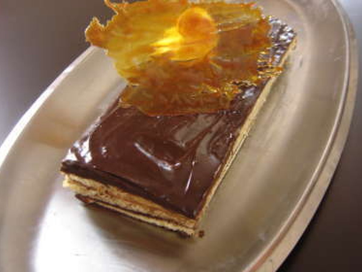 - Sortez le beurre à température ambiante. Réchauffez le four à 230°c. Préparez le buiscuit à opéra. Pour cela mixez la pate d'amandes coupées en dés, la farine et les jaunes d'oeufs jusqu'a obtenir un appareil homogène. Battez les blancs en neige ferme, et ajoutez les a l'appareil délicatement. Couchez le mélange sur une plaque de cuisson chemisée de papier sulfurisé et faites cuire 7 minutes ( Jusqu'a coloration ).