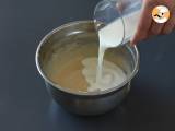 Ajouter ensuite l'œuf, l’arôme de vanille, puis le lait petit à petit pour éviter les grumeaux, tout en mélangeant progressivement.