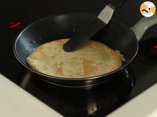 Retourner la crêpe lorsque la pâte se décolle des bords à l'aide d'une spatule, ou en faisant sauter la crêpe ! Laisser cuire la crêpe sur l'autre face et recommencer !