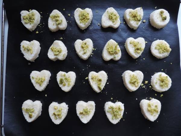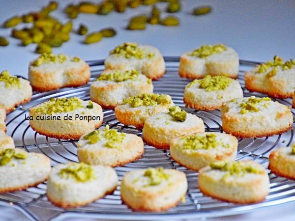 Tiens, j'ai des blancs d'oeufs dans mon frigo! Mais c'est super! A nous les amaretti, financiers et rochers! Et voici des mini rochers à la noix de coco, amande et crème de pistache!