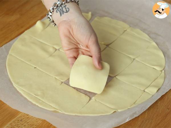 Étaler la pâte sablée puis y découper des carrés de 7cm de large.
