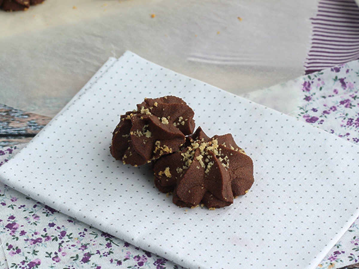 A l'aide d'une poche à douille, formez de petits biscuits sur une plaque de cuisson. Saupoudrez chaque biscuit de poudre de noisette.