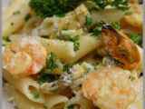 Ingrédients: 375 g de pâtes de votre choix 500 g de crevettes moyennes crues 125 g de noix de Saint-Jacques 60 g de beurre 2 gousses d'ail pilées 125 mL de vin...