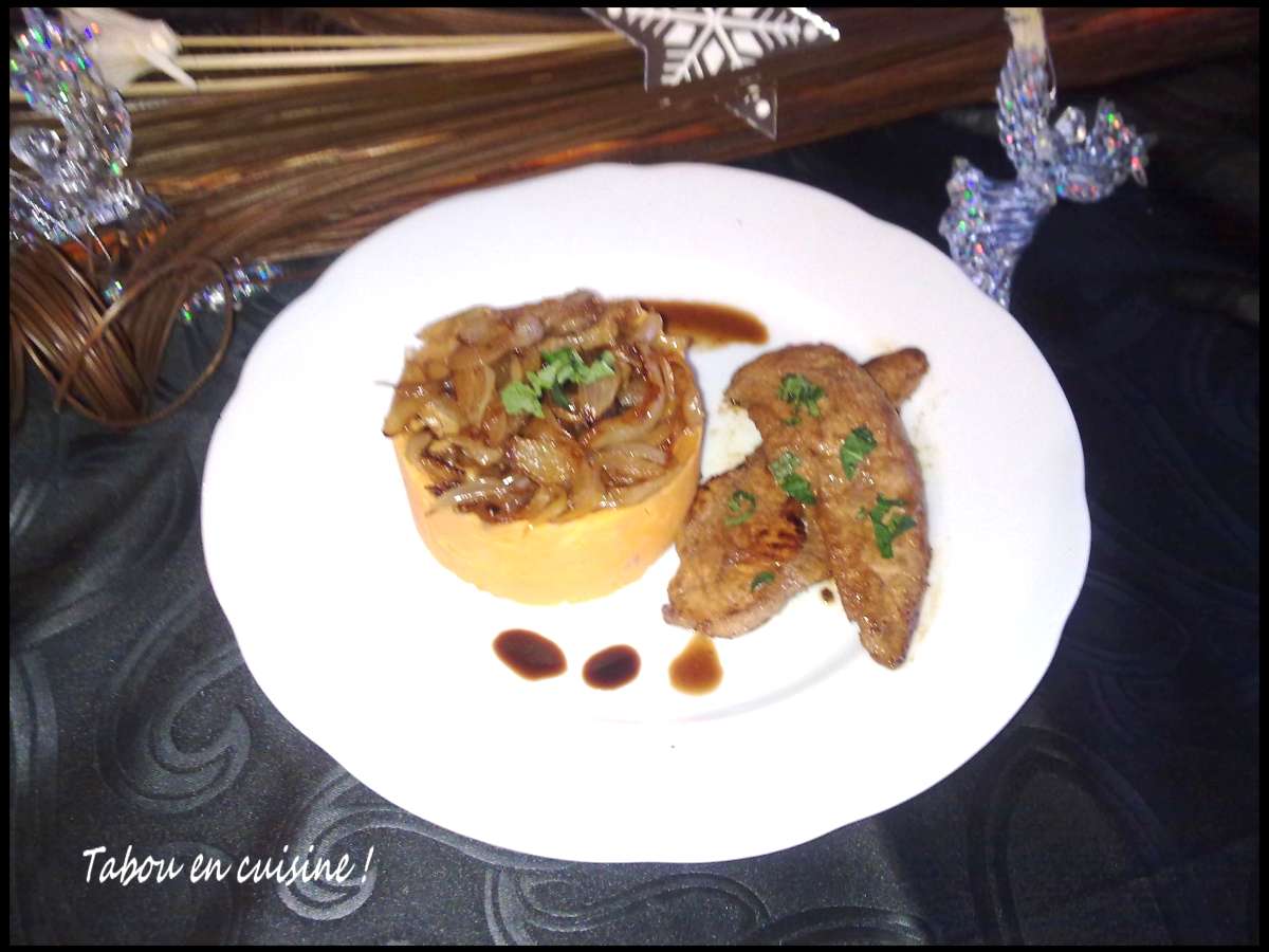 Aiguillettes de canard marinées, écrasé de patates douces et son confit d'oignons