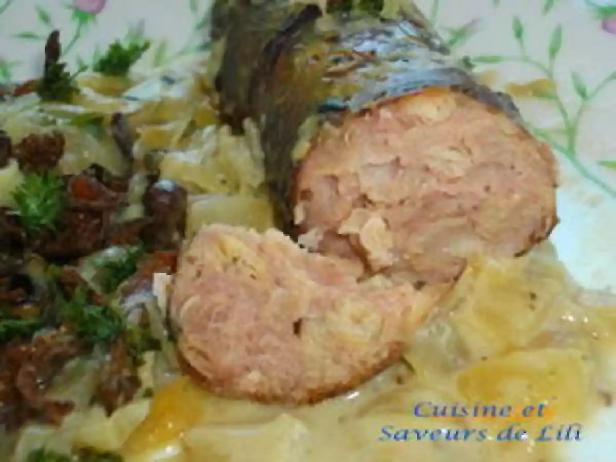 - Piquer les andouillettes et les mettre dans un plat allant au four avec le vin blanc , 3 oignons coupés en morceaux, sel et poivre en grains moulus ensuite cuire à couvert au four 180° pendant 35 à 40 minutes.