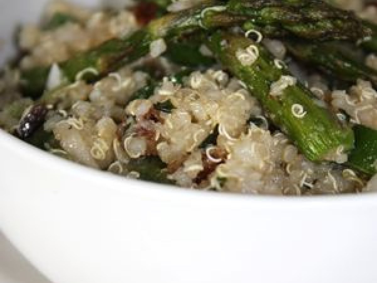 Asperges rôties, oignons nouveaux et quinoa en salade Platfacile30 min Envoyer cette recette à un ami Imprimer cette page Poser une question à l'auteur Publier votre photo de cette recette Ingrédients 2 250 g d'asperges vertes très fines Fleur de sel 3 oignons nouveaux émincés Quinoa cuit Raisins secs Sultanine 1 tête d'ail nouveau émincé 1 cuillère à café de cumin un peu de piment d'Espelette Gomasio Poivre du moulin 1 cuillère à soupe de vinaigre balsamique Menthe fraîche ciselée 1 cuillère à café de sucre rapadura Huile d'olive Huile de sésame Levure maltée
