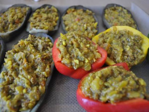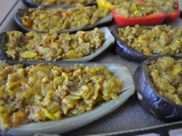 Aubergines et poivrons farcies Platfacile30 min480 Kcal Envoyer cette recette à un ami Imprimer cette page Poser une question à l'auteur Publier votre photo de cette recette Ingrédients 3 3 Aubergines 2 ou 3 poivrons 400 g de viande hachée 2 petits oignons 4 tomates 4 gousses d'ail hachée 1 oeuf 1 cuillère à soupe de concentré de tomate 1 cuillère à soupe de persil haché 1 cuillère à café de curcuma 1 cuillère à café de paprika 1 cuillère à café de cumin Sel et poivre Huile d'olive Coût estimé: 8.38Euros€ (2.79€/part)