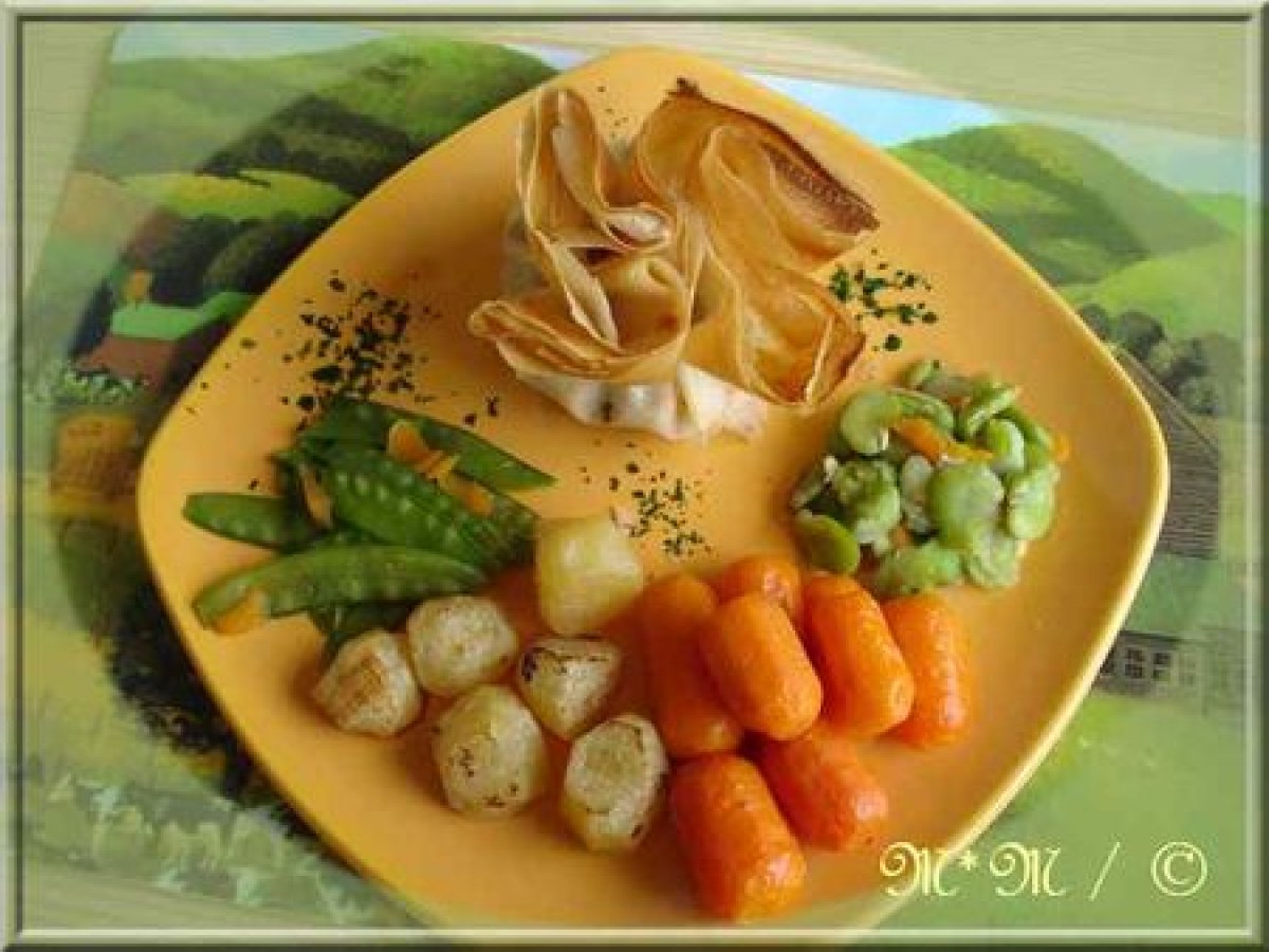 Aumônières de poulet et petits légumes Platfacile1 h 20 m Envoyer cette recette à un ami Imprimer cette page Poser une question à l'auteur Publier votre photo de cette recette Ingrédients 2 2 Filet de poulet 200 g environ Champignons mélange forestier (surgelés) 1 Echalote et oignon nouveau 1 Bouquet garni 6 Carottes Pommes de terre , 3 petites par personne 4 Feuilles de brick 2 cuillères à soupe Crème fraîche 20 environs Pois gourmand (surgelés) 4 cuillères à soupe Fèves (surgelées) Beurre 1 noisette Sel poivre du moulin Persil pour la décoration