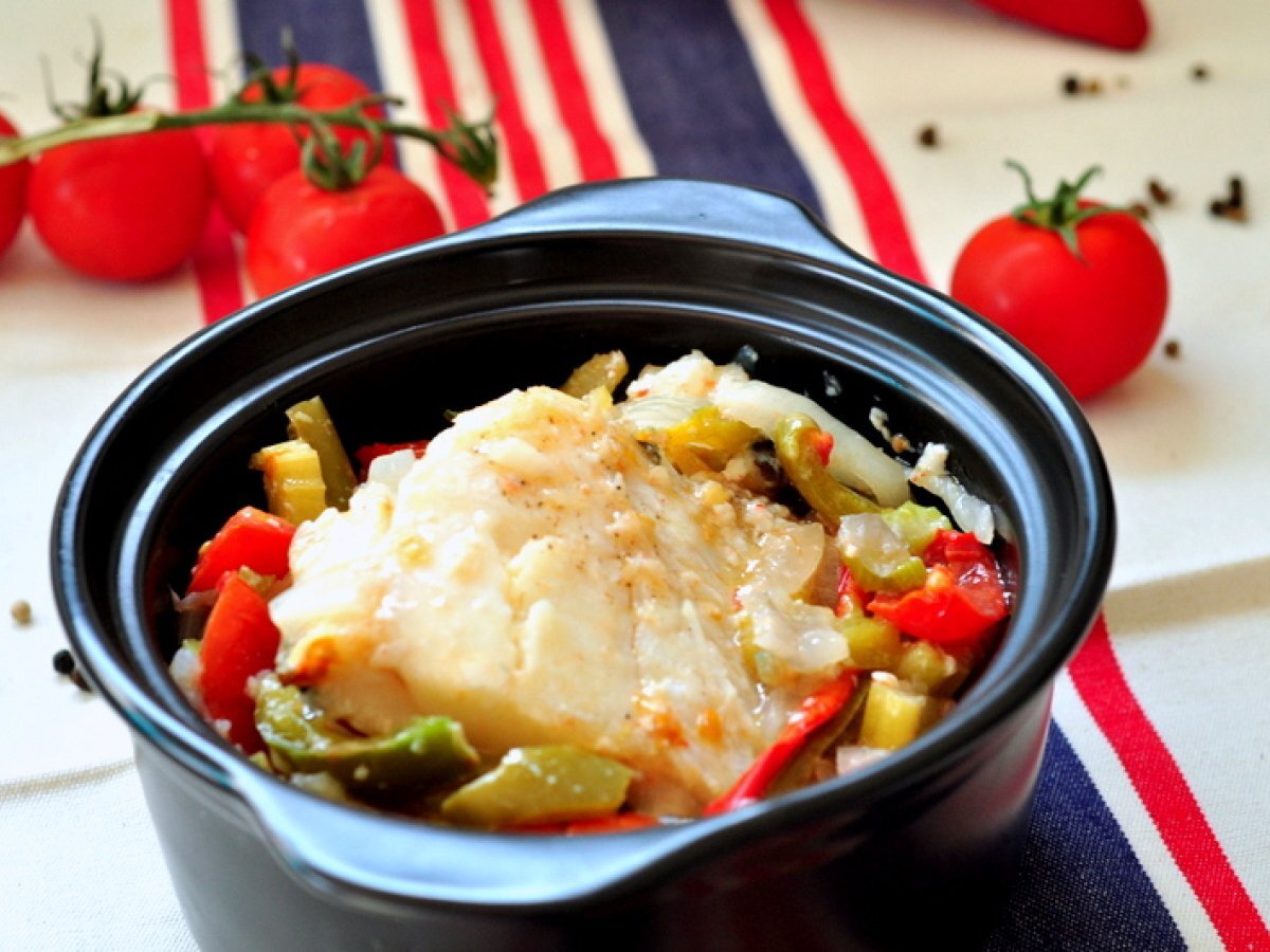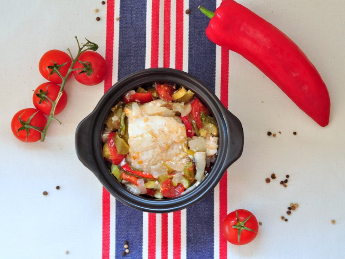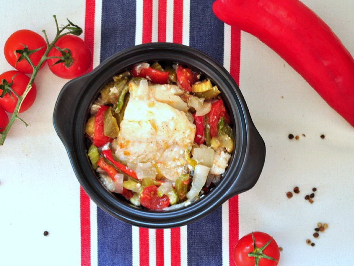- Dans un plat allant au four, versez l’huile d’olive, puis ajoutez l’oignon émincé, les tomates coupées en quartiers, les poivrons épépinés et émincés ainsi que la branche de céleri coupée en fin tronçons. Salez et poivrez les légumes puis déposez les morceaux de morue dessalés sur le dessus.