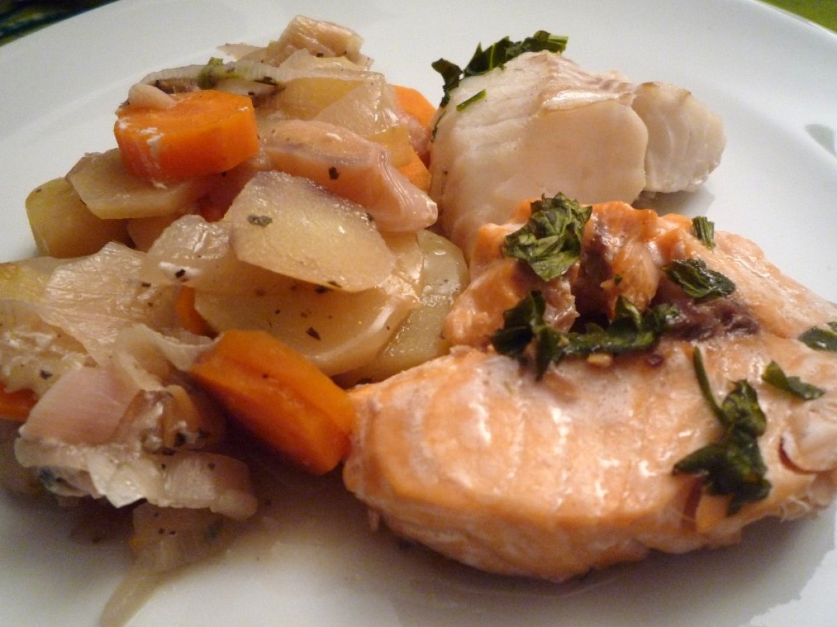 Baeckeoffe aux deux poissons PrécédentSuivant Platfacile1 h 20 m Envoyer cette recette à un ami Imprimer cette page Poser une question à l'auteur Publier votre photo de cette recette Ingrédients 4 1 kg de pommes de terre 1 oignon 4 carottes 3 blancs de poireau 400 g de filet de saumon coupé en 4 médaillons 400 g de cabillaud coupé en 4 médaillons 75 cl de Riesling ou d’Edelzwicker 2 cuillères à soupe d’huile d’olive sel poivre thym et laurier