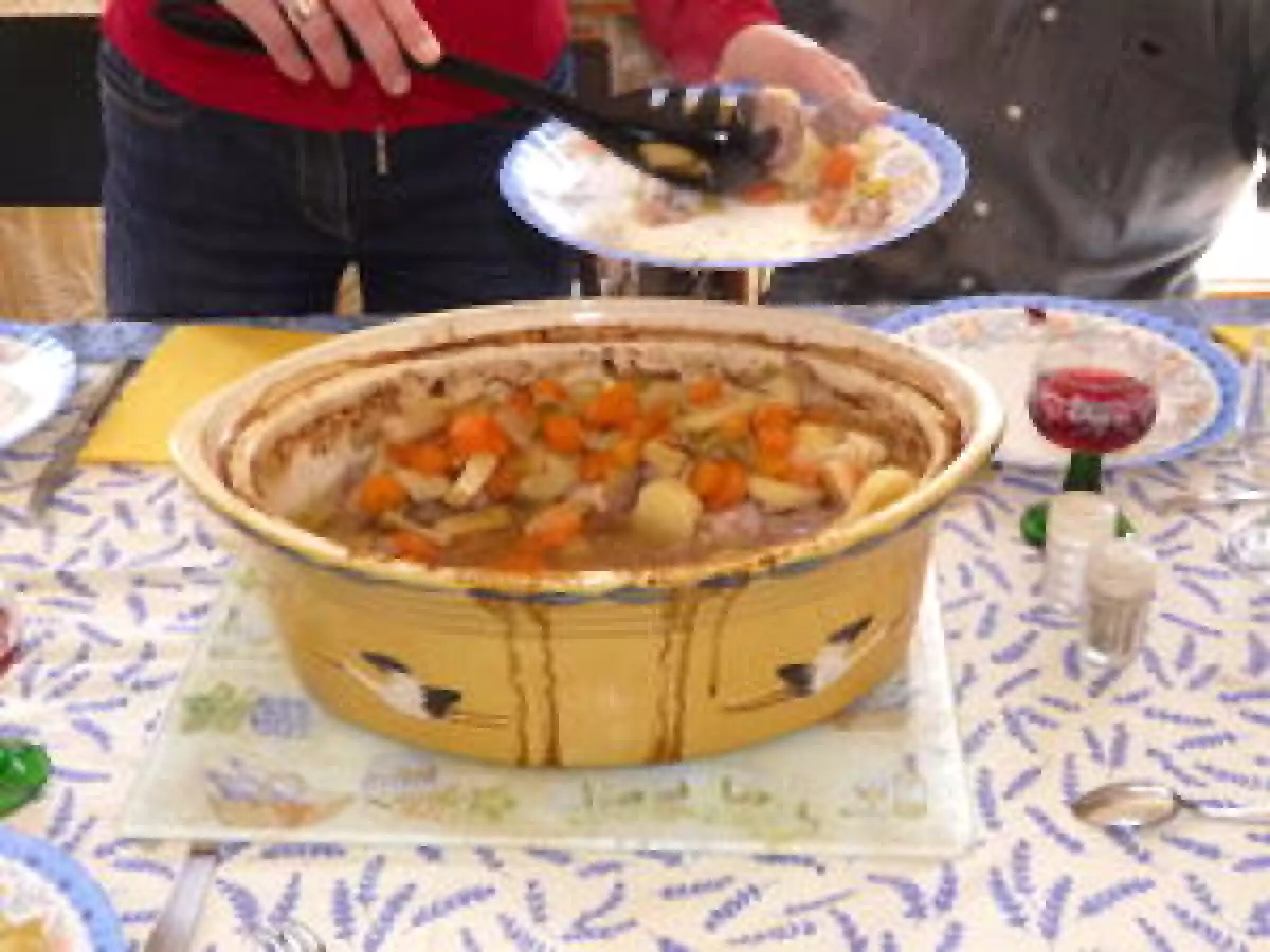 Égoutter les 3 viandes et réserver le jus de la marinade. - Dans la terrine beurrée, disposer successivement : 1 couche d'oignons, 1 couche de pommes de terre et carottes, les morceaux de viande, le pied de porc fendu en 2, 1 couche de pommes de terre et carottes, le poireau.
