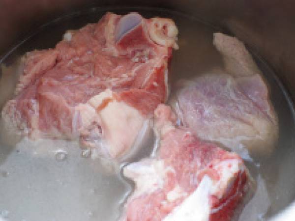 Faire cuire la viande à la cocotte minute, la recouvrir d’eau, saler et poivrer.