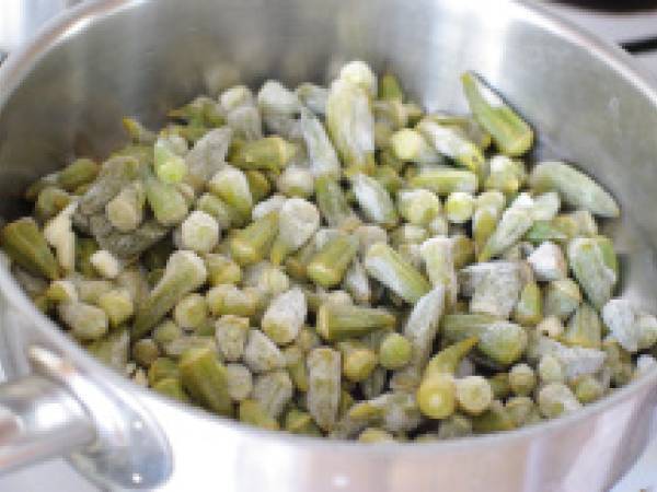 Laver et retirer la tête des gombos. Dans une sauteuse, faire sauter les gombos avec l’ail émincé et l’huile pendant 30 minutes environ. Ne pas utiliser de cuillère pour mélanger, les gombos sont fragiles.