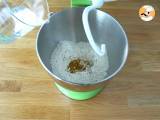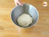 Dans un bol, mettez tous les ingrédients de la pâte (attention à ce que la levure ne touche pas le sel, qui la "tue" instantanément"). Mélangez jusqu'à avoir une pâte homogène, puis pétrissez 5 petites minutes.