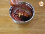 Ajoutez les gousses d'ail écrasées à la viande de porc. Combinez avec la sauce soja et l'huile d'olive.