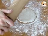 Appuyez sur la pâte gonflée afin de faire sortir l'air. Puis, prenez une petite boule de pâte (environ 50 gr), et étalez la sur un plan de travail fariné. Formez un cercle d'environ 10 cm de diamètre.