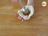 Placez ce cercle de pâte sur votre main, et placez 2 c. à soupe de la farce (plus ou moins) au centre du cercle.