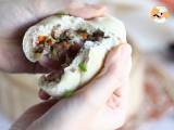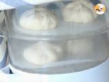 Refermez cette brioche en pinçant la pâte afin de bien la sceller. Posez les banh bao formés dans un panier vapeur, tapissé de papier sulfurisé afin qu'ils ne collent pas. Laissez reposer à température ambiante une vingtaine de minutes.