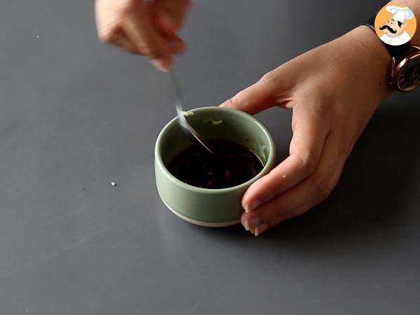 Mélanger la sauce soja, le vinaigre de riz, la gousse d'ail et le gingembre frais écrasés.