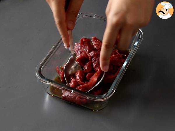 Couper la viande en lamelles et la disposer dans un contenant hermétique. Verser la marinade, mélanger et refermer le contenant. Mettre 1 heure au frais.
