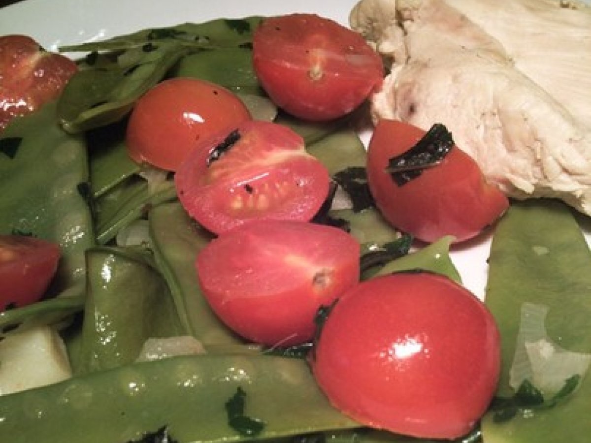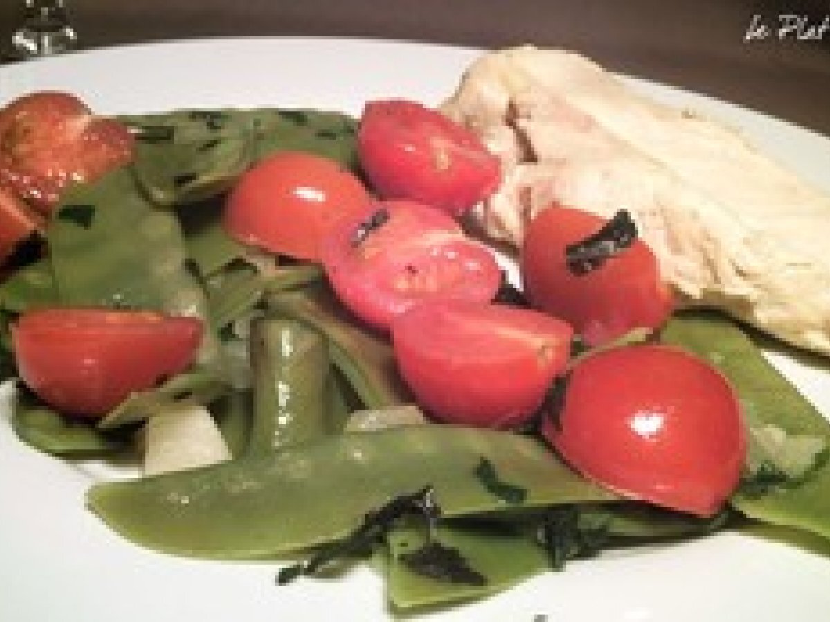 Blanc de poulet poché, pois gourmands et tomates cerises