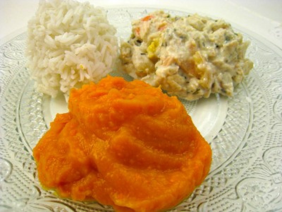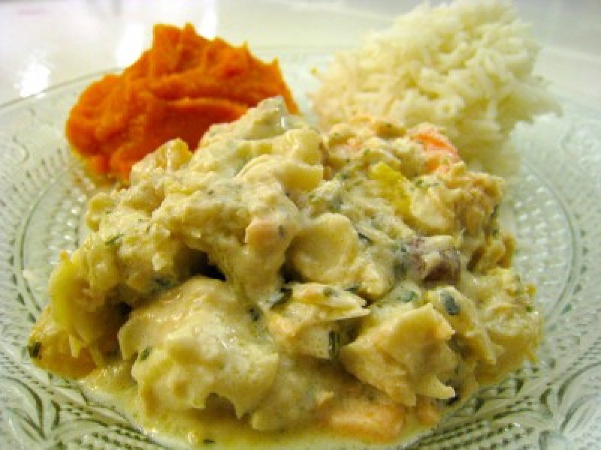 Blanquette de poissons sans lait sans gluten votez maintenant PrécédentSuivant Platfacile1 h 20 m Envoyer cette recette à un ami Imprimer cette page Poser une question à l'auteur Publier votre photo de cette recette Ingrédients 12 800 g de noix de St Jacques 500 g de grosses crevettes cuites et décortiquées 3 beaux filets de colin 3 beaux filets de cabillaud 3 beaux filets de saumon 3 L de court-bouillon (carotte, céleri, oignons, ail, cerfeuil, persil, gingembre, paprika, citron…) 3 beaux oignons rouges émincés 4 gousses d’ail 2 échalotes 1/2 verre d’huile d’olive 10 abricots moelleux (au rayon fruits secs) 2 poignées de raisins secs 2 poignées d’amandes effilées 40 cl de crème de soja cuisine 40 cl de crème ou lait de coco une poignée d’herbes fraîches hachées (aneth, coriandre, persil, romarin…) thym, laurier 2 cuillères à soupe d’écorce de citron en poudre 1 cuillère à soupe de gingembre en poudre sel poivre La purée de potimarron : 1 ou plusieurs potimarron(s)