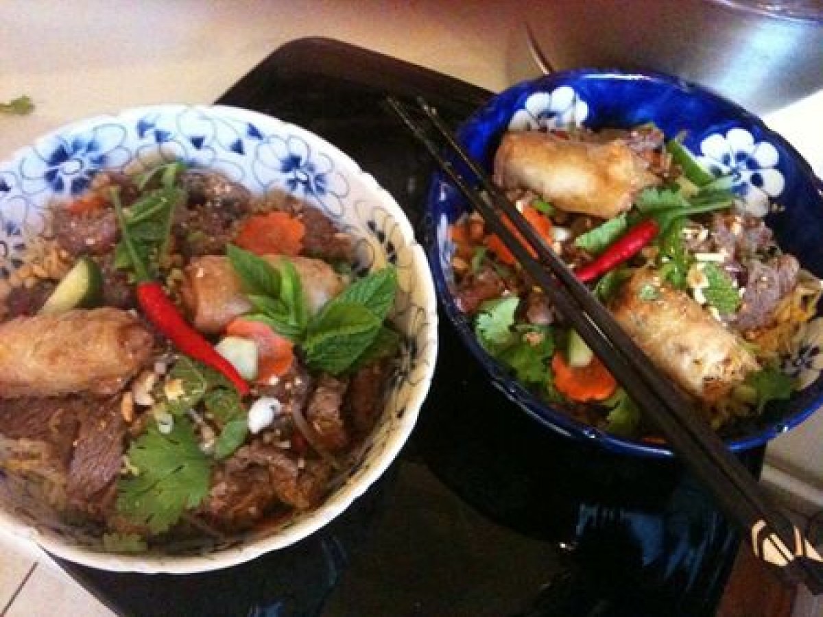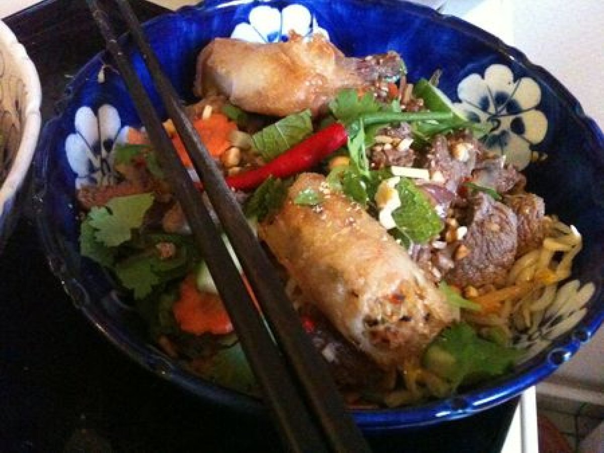 Bo bun de hanoï (vietnam) PrécédentSuivant Platmoyen30 min Envoyer cette recette à un ami Imprimer cette page Poser une question à l'auteur Publier votre photo de cette recette Ingrédients 2 1 beau faux-filet 2 échalotes 1 bâton de citronnelle 1 gousse d'ail ½ cuillère à café de purée de piment vert Sel, poivre 1 cuillère à soupe d'huile de sésame 1 cuillère à café de sucre 1 grosse poignée de cacahuètes 4 nems Salade Menthe, basilic thaï, coriandre, cives 2 petites poignées de germes de soja 1 grosse carotte 25 cl d'eau 5 cuillères à soupe de vinaigre blanc 1 cs de sucre 1 pincée de sel 2 cuillères à soupe de nuoc mam ½ concombre 1 cuillère à soupe de sucre 100 gr de vermicelle de riz Sauce pour nems