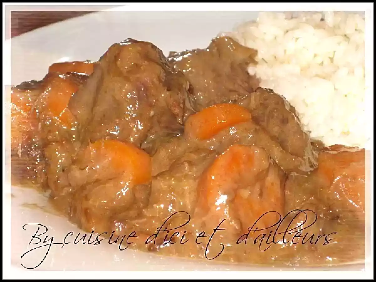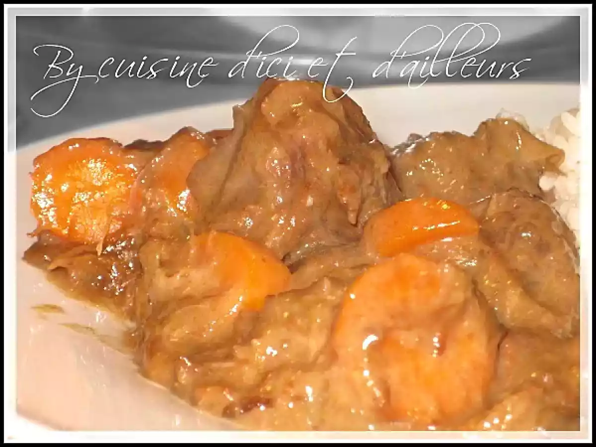Une variante du bourguignon...j'ai même préféré cuisinée de cette façon et chez moi il n'en ai pas resté une miette. Plus doux qu'avec le vin...a refaire