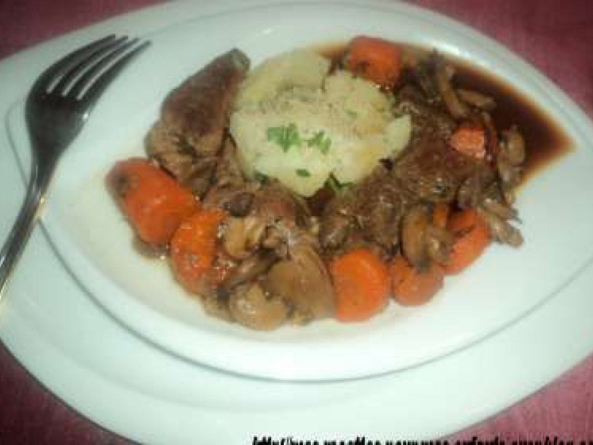 Boeuf bourguignon au vinaigre balsamique à ma façon Platfacile4 h 15 m Envoyer cette recette à un ami Imprimer cette page Poser une question à l'auteur Publier votre photo de cette recette Ingrédients 4 1 kg de viande de boeuf (paleron ou gite ) 50g de beurre ou 3 cas d'huile d'olive ( pour ma part) 2 gros oignons émincés. 4 gousses d'ail 2 cas de farine 1 bouquet garni (persil, laurier ,thym,romarin) 3 cuillères à soupe de Vinaigre Balsamique sel & poivre 300g de champignons de Paris 500 gr de carottes en rondelles. 1 cube de bouillon de buf 5 pommes de terre