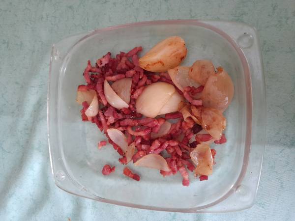 Dans une cocotte, faire fondre le beurre puis ajouter les petits oignons entiers et les lardons. Faire revenir en remuant. Une fois les lardons et les oignons bien dorés, les retirer avec un écumoire et les mettre de coté.