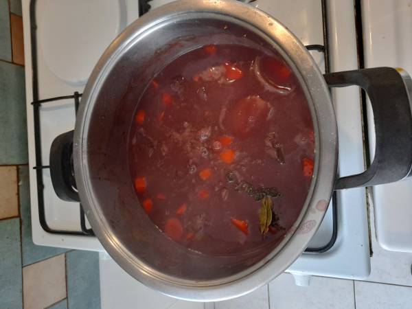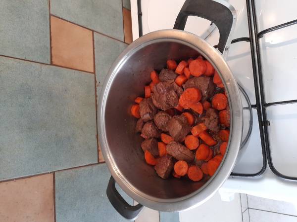 Dans la même cocotte, faire revenir les morceaux de bœuf et les carottes pour les faire dorer.- Saupoudrer de farine et bien remuer. Ajouter le bouillon de bœuf et bien déglacer la cocotte.