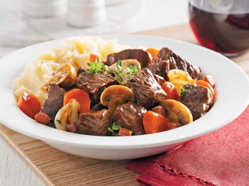 Morceaux de boeuf à bourguignon bien tendre, avec carottes et champignon, le tout cuit dans une bonne sauce au vin de bourgogne