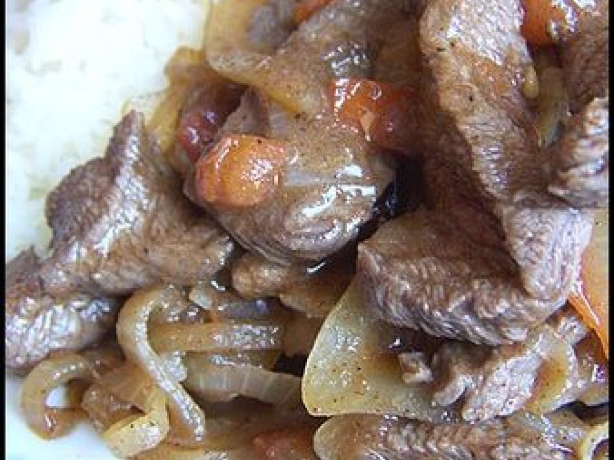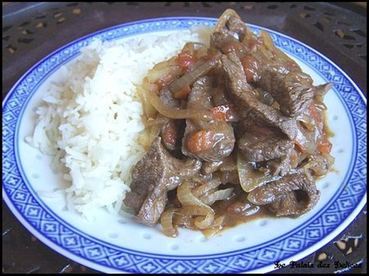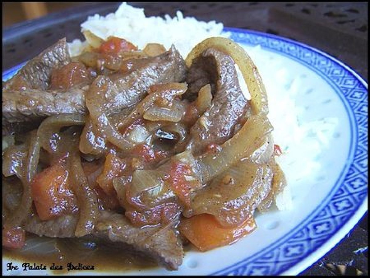 Ce plat se prépare très rapidement et facilement dans un wok, il se compose de steak bœuf à peine poêlé afin qu'il reste moelleux et tendre, émincé en lanières tout comme les oignons fondants et translucides agrémenté de petits dés de tomates, sauce de soja, nuoc mam et du caractéristique mélange " cinq parfums " chinois qui donne ce gout inimitable, authentique et sa belle couleur marron à la sauce. Que du bonheur!