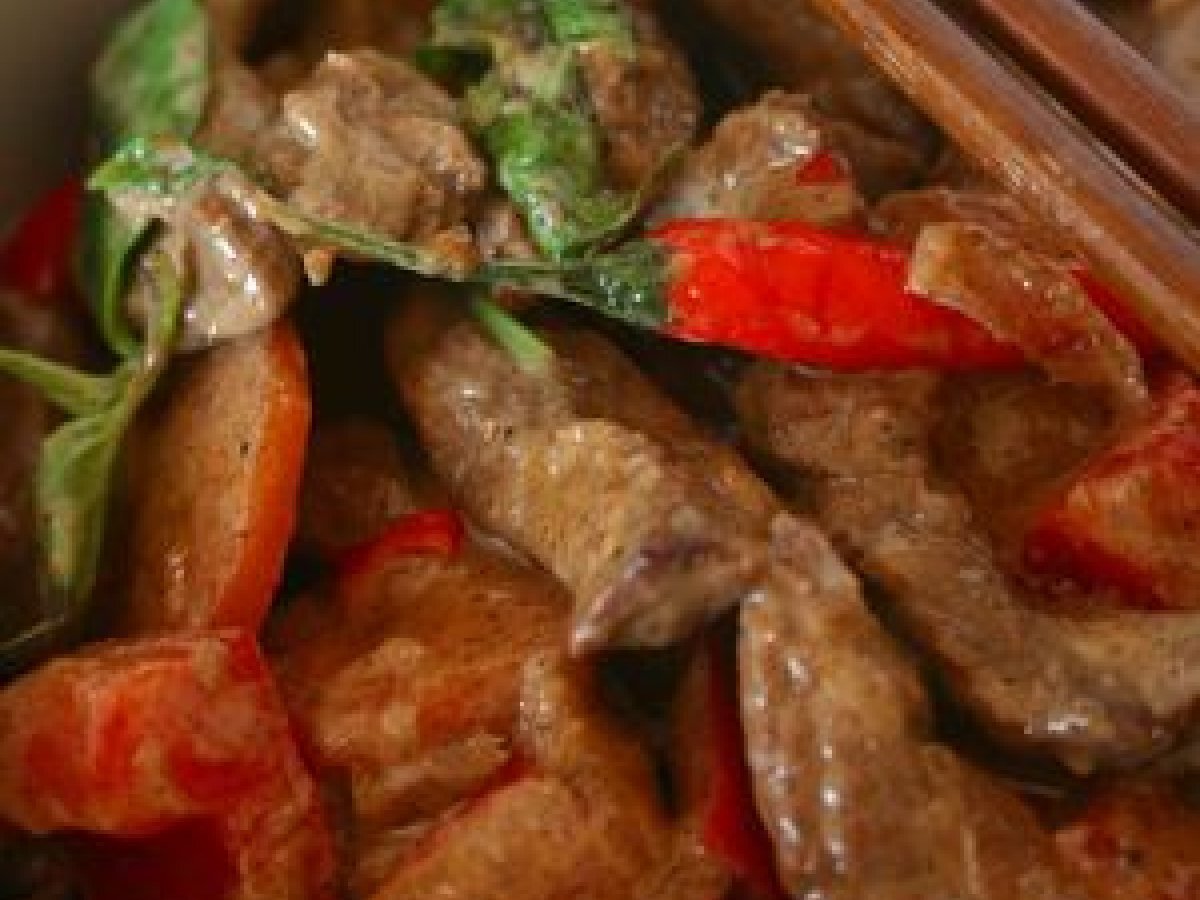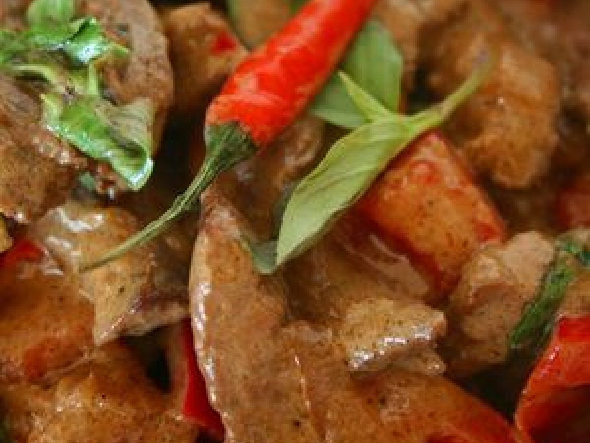 Boeuf piquant au lait de coco (thaïlande) votez maintenant PrécédentSuivant Platfacile25 min Envoyer cette recette à un ami Imprimer cette page Poser une question à l'auteur Publier votre photo de cette recette Ingrédients 4 500 g de beauf (Bifteck, à fondue...) 200 ml de lait de coco 1 poivron rouge 1 carotte 2 échalotes 4 piments rouges forts 2 brins de Basilic Thaï 1 morceau de gingembre frais de la taille d'un pouce 1 morceau de Galanga frais de la taille d'un pouce 4 à 6 racines de coriandre 4 gousses d'ail 2 cuillères à soupe de sauce Nuoc-mâm 2 cuillères à soupe de sauce Soja claire Sel, poivre 4 cuillères à soupe d'huile d'arachide