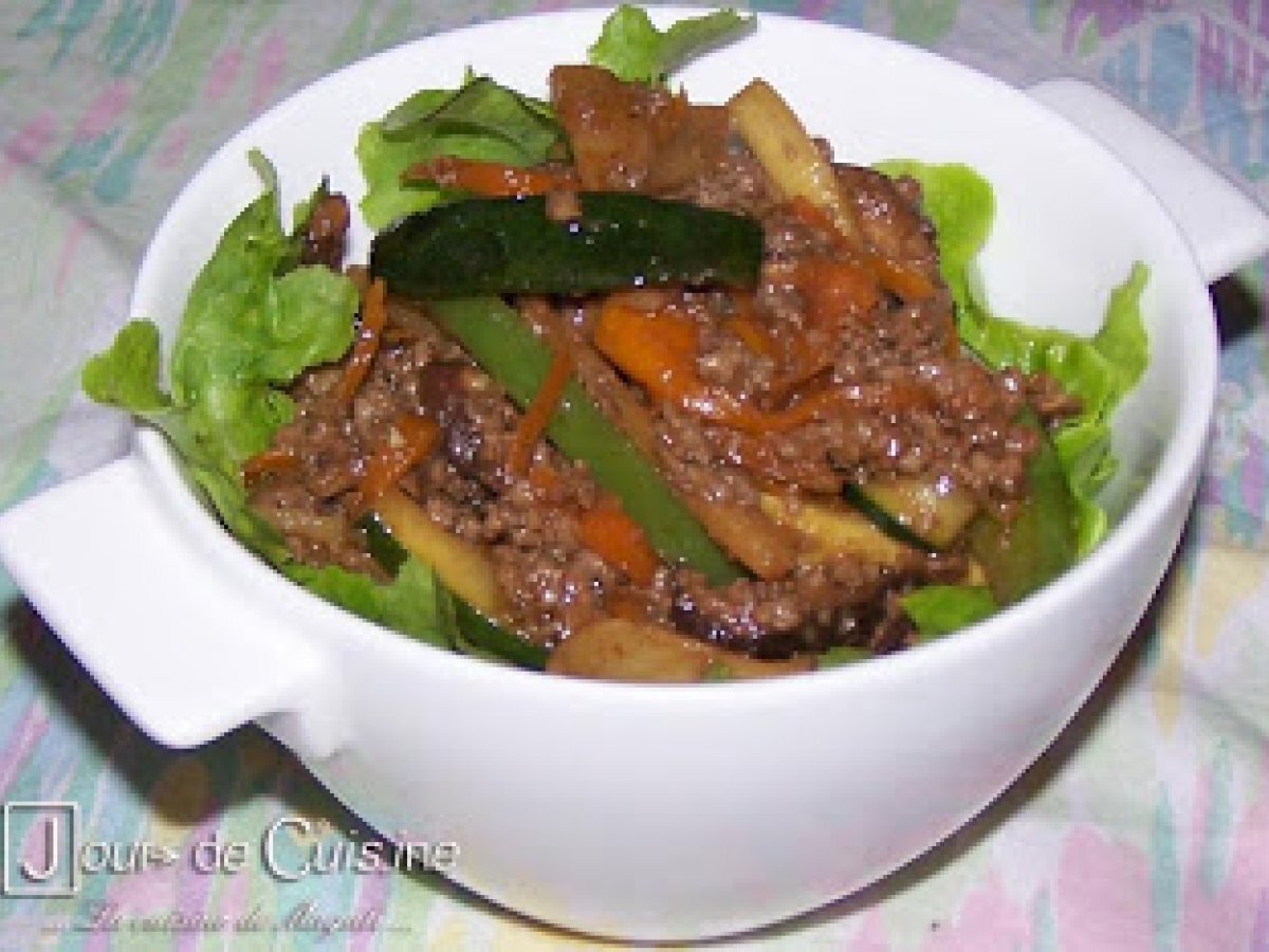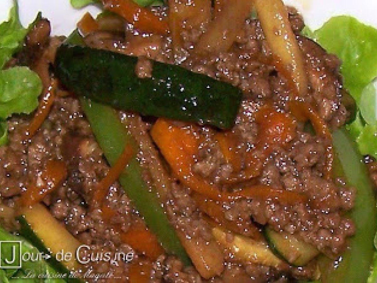 Boeuf sauté aux légumes et laitue votez maintenant PrécédentSuivant Platfacile21 min242 Kcal Envoyer cette recette à un ami Imprimer cette page Poser une question à l'auteur Publier votre photo de cette recette Ingrédients 6 450 g de viande de boeuf hachée 1 cuillerée à soupe de vin de riz de Shaoxing 1 cuillerée à soupe de sauce de soja claire 2 cuillerées à café d'huile de sésame 2 cuillerées à café de Maïzena 100 g de carottes 100 g de courgettes 100 g de pousses de bambou en conserve 100 g de poivron rouge ou vert 15 g de champignons chinois sèches 225 g de coeur de laitue 1 cuillerée à soupe d'huile 1 cuillerée à soupe d'ail finement haché 1 cuillerée à soupe d'échalote 3 cuillerées à soupe de ciboule finement hachée 2 cuillerées à café de sauce de soja noire 2 cuillerées à café de vin de riz de Shaoxing 2 ou 3 cuillerées à soupe de sauce hoisin 2 cuillerées à soupe de sauce d'huître 1/2 cuillerée à café de sel 1/2 de cuillerée à café de poivre gris moulu 4 cuillerées à soupe de sauce hoisin Coût estimé: 10.93Euros€ (1.82€/part)