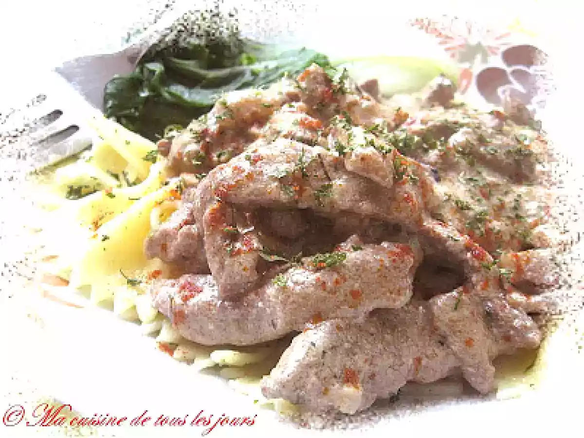 Boeuf stroganoff à la manière bistro Platfacile2 h 15 m714 Kcal Envoyer cette recette à un ami Imprimer cette page Poser une question à l'auteur Publier votre photo de cette recette Ingrédients 4 2 cuillères à soupe (30 ml) de beurre 2 cuillères à soupe (30 ml) d'huile d'olive 1 kg (2 lb) de boeuf émincé (en lanières) 4 gousses d'ail hachées finement 6 échalotes françaises hachées finement 1/2 lb (250 g) de champignons de Paris émincés 1/2 tasse (125 ml)de vin blanc sec 4 tasses (1 L) de bouillon de boeuf 1 cuillère à soupe (15 ml) de beurre manié* 2 cuillères à thé (10 ml) de thym séché 1 cuillère à thé (5 ml) de romarin séché 2 feuilles de laurier 1/2 tasse (125 ml) de crème 15% champêtre 1 oeuf battu 2 cuillères à thé (10 ml) de moutarde de Dijon 1 cuillère à thé (5 ml) de paprika Persil frais haché Sel poivre Coût estimé: 21.67Euros€ (5.42€/part)