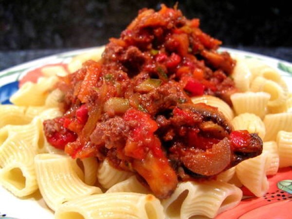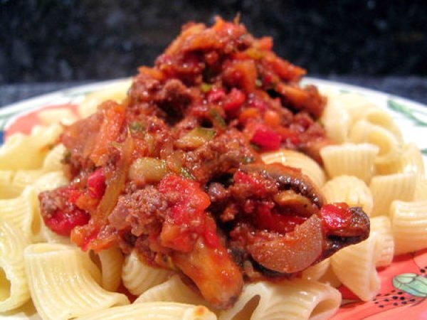 Bolognaise rapide aux légumes votez maintenant PrécédentSuivant Platfacile45 min Envoyer cette recette à un ami Imprimer cette page Poser une question à l'auteur Publier votre photo de cette recette Ingrédients 2 500 g pâtes 1 gros oignon ou 2 moyens 1 grosse gousse d'ail ou 2 petites 1 poivron rouge 2 carottes moyennes 2 branches de céleri 1 courgette 2 poignées de champignons de Paris frais ou 1 poignée de champignons de Paris en lamelles, frais ou surgelés 500 g viande hachée crue ou cuite 1 petit verre de vin rouge (facultatif) 1 boite de pulpe de tomate (400 g) 1 cuillère à soupe concentré de tomate sel poivre huile d'olive thym persil etc... parmesan fraîchement râpé