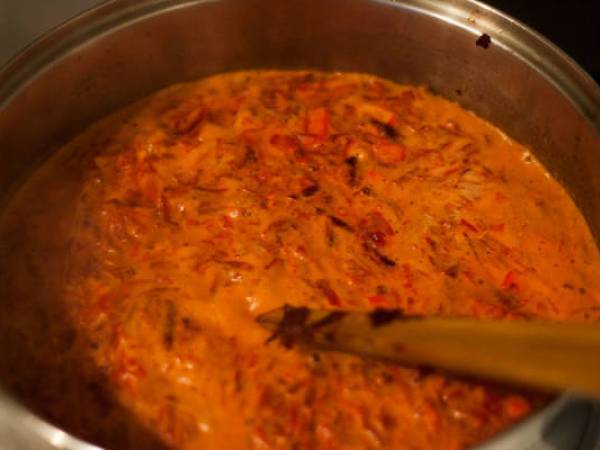 Émincer finement l’oignon et faire le revenir dans de l’huile au feu doux- Ajouter les autres la carotte et le céleri-rave (râpés) et le poivron rouge coupé en petits dés
