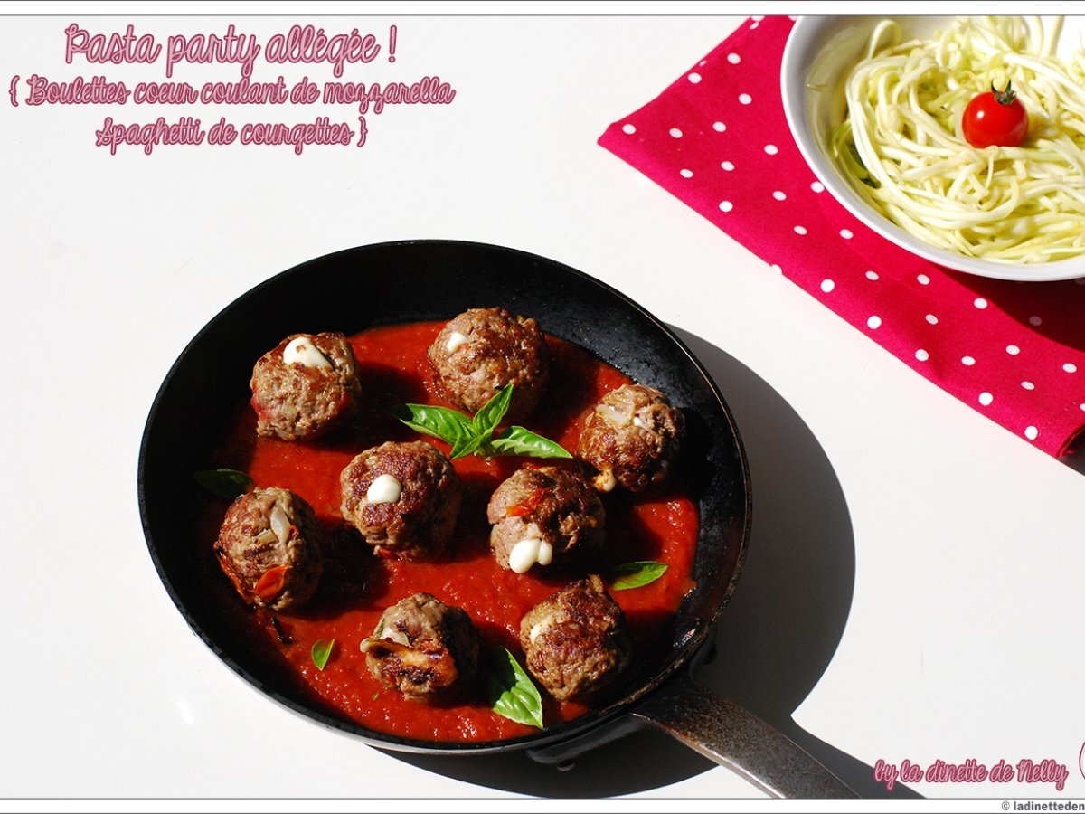 Des boulettes de boeuf au coeur filant de mozzarella, une sauce tomate, des spaghettis de courgette ... ma pasta party en mode allégé. La preuve que l'on peut se faire plaisir tout en surveillant sa ligne !