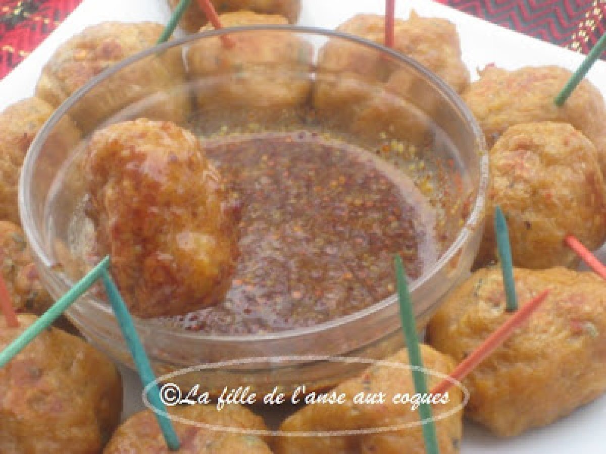 Boulettes de saucisses et d'oeufs à la moutarde épicée au miel votez maintenant Platfacile25 min Envoyer cette recette à un ami Imprimer cette page Poser une question à l'auteur Publier votre photo de cette recette Ingrédients 4 4 saucisses italiennes (environ 500 g) fortes dont on a retiré la membrane ½ tasse (125 ml) de fromage cheddar fort râpé ½ tasse (125 ml) de farine instantanée (sinon de la farine tout usage) 2 cuillères à thé (10 ml) de poudre à pâte (levure chimique) 1 cuillère à soupe de flocons d'oignon séchés 1 cuillère à thé (5 ml) de poudre d'ail 1 cuillère à soupe (15 ml) de ciboulette séchée 1 cuillère à soupe (15 ml) de sauce Worcestershire 2 oeufs battus Sel poivre du moulin Moutarde épicée au miel : ½ tasse (125 ml) de moutarde à l'ancienne 2 cuillères à soupe (30 ml) de miel liquide ¼ cuillère à thé (1 ml) de paprika Pincée de poivre de Cayenne